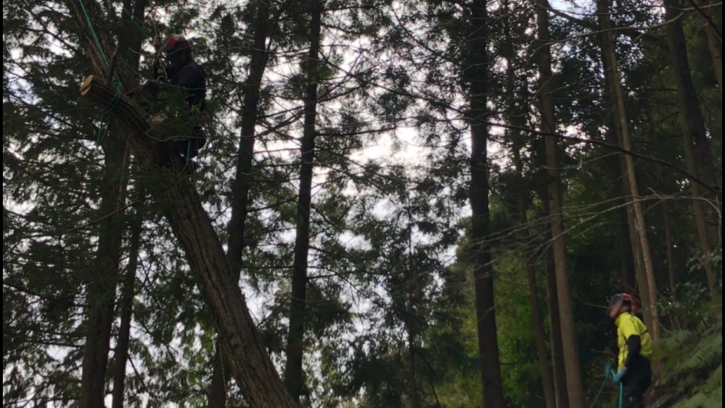 ロープ等を使用し作業しにくい場所や機械が使用できない場所でもお安く作業できる特殊伐採の熟練の技術を持っております。